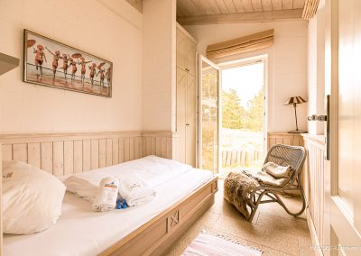 Das kleine Schalfzimmer mit Blick in den Wohnraum im Strandhaus Fischer